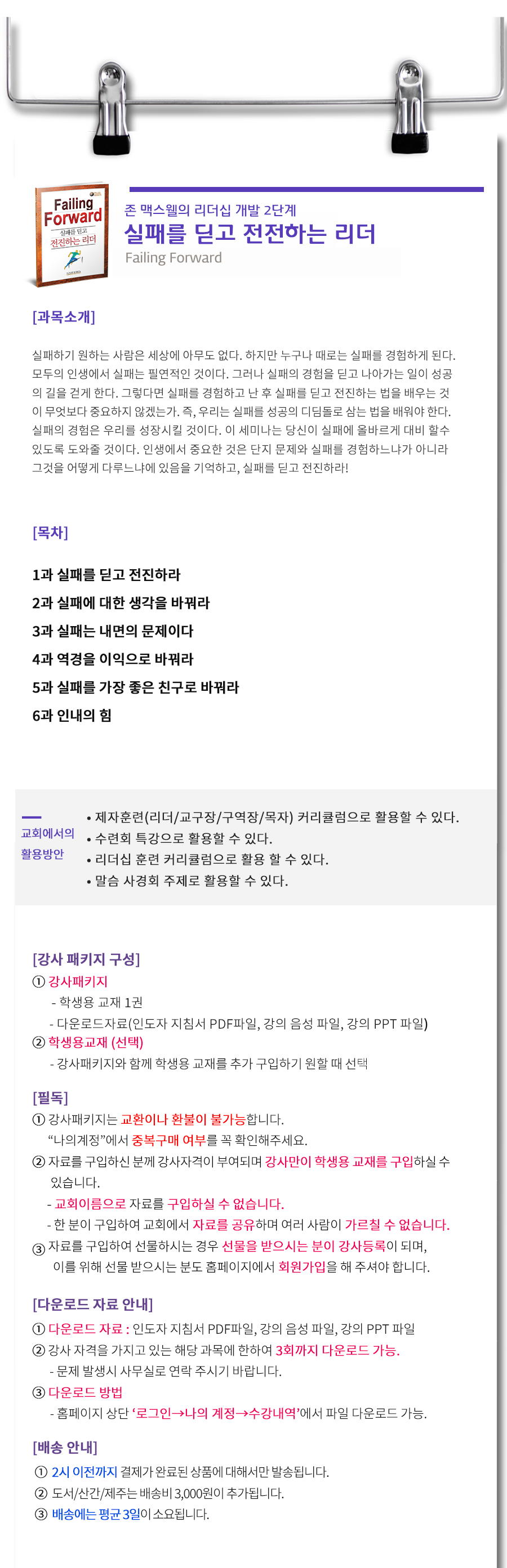 과목소개 글보기실패를 딛고 전진하는 리더 운영자 조회수 754 2019-06-03 16:14:37카테고리지도력개발 실패를 성공의 디딤돌로 삼는 법<실패를 딛고 전진하는 리더>세미나를 소개합니다^^ - 디모데성경연구원 - 미리 보기■ 학생용 강의안■ 강의용 PPT 안내사항- <실패를 딛고 전진하는 리더>는 "이큅 리더십 특강"이라는 이름의 세미나에서 다뤄집니다.- 세미나에 참석하기 원하시는 분은 본 연구원의 홈페이지에서 "이큅 리더십 특강" 일정을 확인 해주세요.- "이큅 리더십 특강" 세미나에 참석하신 후 패키지를 구입하시면 강사자격이 주어집니다.- 강사 자격이 있으신 분만이 각 교회에서 세미나를 진행하실 수 있으며, 교재도 주문이 가능합니다.- 리더십 개발 2단계(6과목)를 모두 구입하시면 학생용 강의안 PDF파일을 추가로 드립니다.- 교재는 디모데성경연구원/월드티치에서만 구입이 가능합니다.- 문의사항이 있으신 경우 02-2652-0919로 전화주시면 감사하겠습니다. #실패# 전진# 리더# 리더십# 리더교육# 리더십교육# 리더십강의# 디모데성경연구원# 이큅# EQUIP 목록답변글쓰기 이전신약책별성경연구운영자2019-05-30-실패를 딛고 전진하는 리더운영자2019-06-03다음심플한 구약의 파노라마운영자2019-05-30 Powered by MangBoard