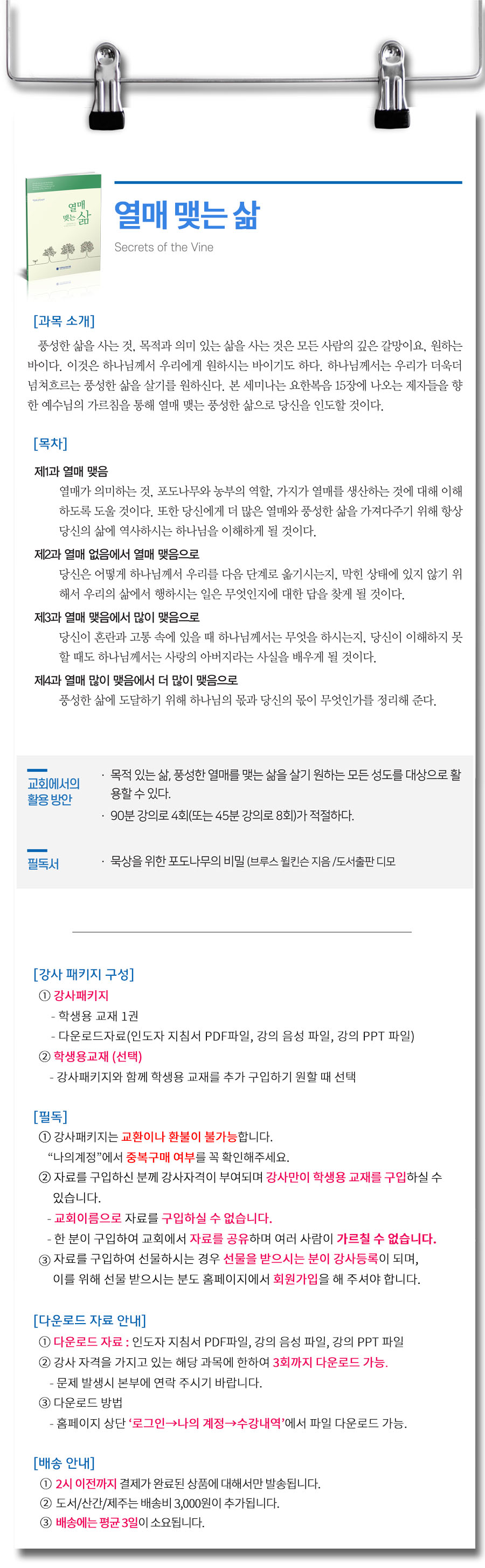 과목소개 글보기열매 맺는 삶 : 포도나무의 비밀 (개정판) 운영자 조회수 1326 2019-06-10 16:44:33카테고리성경공부 열매 맺는 풍성한 삶으로 인도해 줄포도나무의 비밀 : 개정판열매 맺는 삶 세미나를 소개합니다^^ - 디모데성경연구원 - 미리 보기■ 학생용 강의안■ 강의용 PPT#포도나무의비밀# 포도나무# 비밀# 디모데성경연구원# 성경공부# 월드티치 목록답변글쓰기 이전심플한 신약의 파노라마운영자2019-05-30-열매 맺는 삶 : 포도나무의 비밀 (개정판)운영자2019-06-10다음영적 도약의 경험운영자2019-06-10 Powered by MangBoard