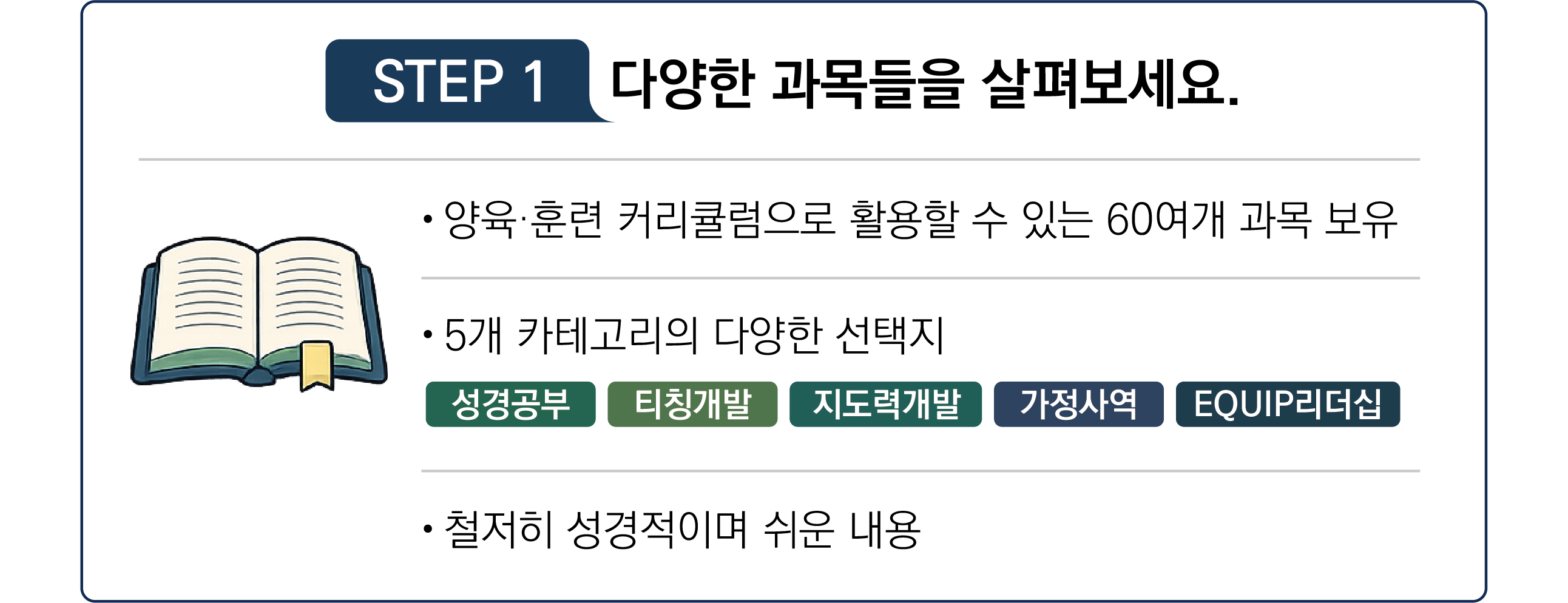 - 성경 공부(본문 중심, 주제 중심) / 티칭 개발 / 지도력 개발 / 가정 사역 / 이큅 리더십 등의 카테고리로 구성돼 있습니다.