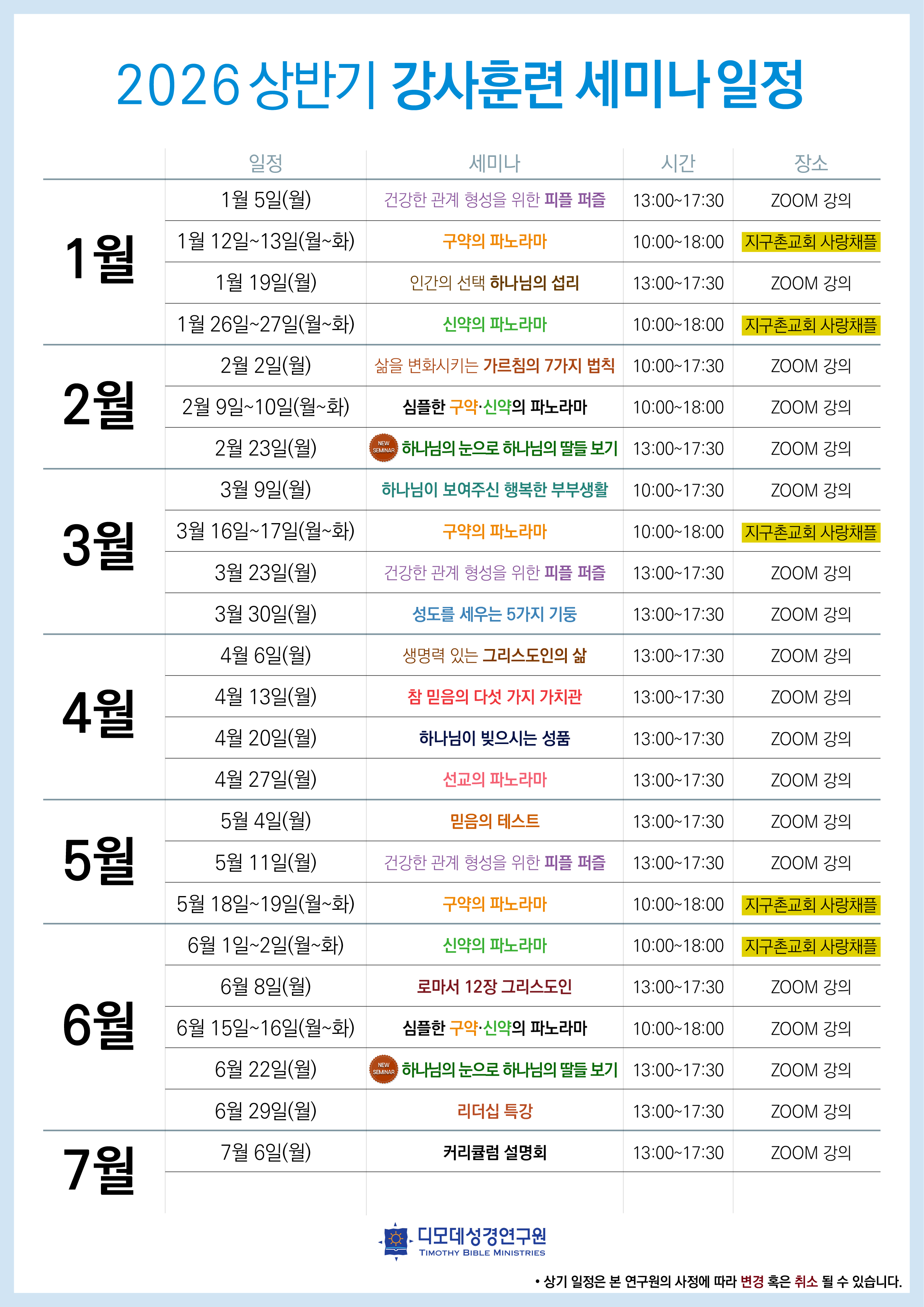 공지사항 제목2026년 상반기 강사훈련 세미나 일정안내2025-11-17 14:57:27작성자디모데성경연구원샬롬! 디모데성경연구원의 2026년 상반기 강사훈련 세미나 일정을 아래와 같이 공지합니다. 본 연구원에 구비된 다양한 과목들을 활용하여 교회의 양육·훈련 커리큘럼을 구성해 보세요. ※ 본 연구원의 모든 '세미나'는 강사훈련 세미나입니다. 참여하시는 분들은 단순히 강의를 듣고 배우는 학생으로서가 아니라, 배워서 직접 가르칠 수 있는 예비 강사로서 참여합니다. 세미나를 참여·수료하시면 해당 과목의 강사 자격을 얻게 되어 여러분의 목회 현장에서 직접 가르칠 수 있습니다. 세미나 수료자에게 강사패키지(인도자 지침서/ 강의 음성mp3 / 프리젠테이션ppt 등등: 과목에 따라 패키지 구성은 상이함)가 제공되며, 해당 과목의 교재를 구매하실 수 있는 권한도 부여됩니다. 목록 -2026년 상반기 강사훈련 세미나 일정안내디모데성경연구원2025-11-17다음[새 과목 출시] 신규 세미나가 오픈됩니다!디모데성경연구원2025-11-07 Powered by MangBoard