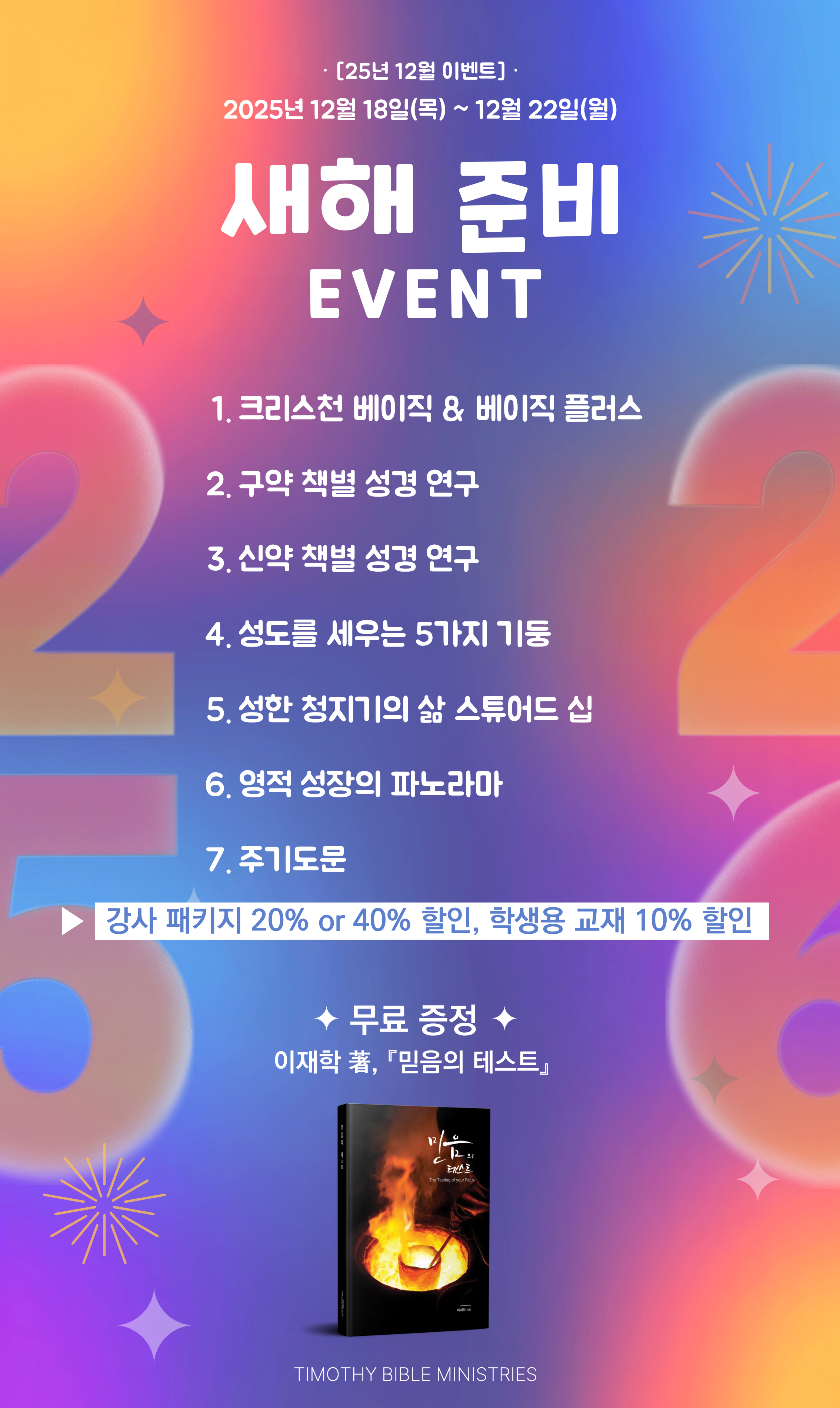 샬롬! 성탄과 송구영신을 기다리는 연말이 되었습니다. 한해를 차근차근 돌아보며 받은 은혜를 세어보고, 자원하는 심령을 하나님께 드리는 지혜, 곧 날을 계수하는 지혜가 필요한 때입니다. 하나님을 충분히 가까이하시며 지혜로 충만하시기 바랍니다. 이번 12월의 이벤트는 새해 2026년을 눈앞에 둔 때인만큼 연초 또는 봄 학기에 새롭게 시작하기에 좋은 과목들을 준비했습니다. 성경 본문을 꾸준히 살펴볼 수 있는 과목, 신앙의 기초를 다지는 과목 등 두 가지 카테고리입니다. 저희 디모데의 쉽고, 말씀 중심의 과목들 활용하셔서 풍성한 새해를 계획해 보세요!