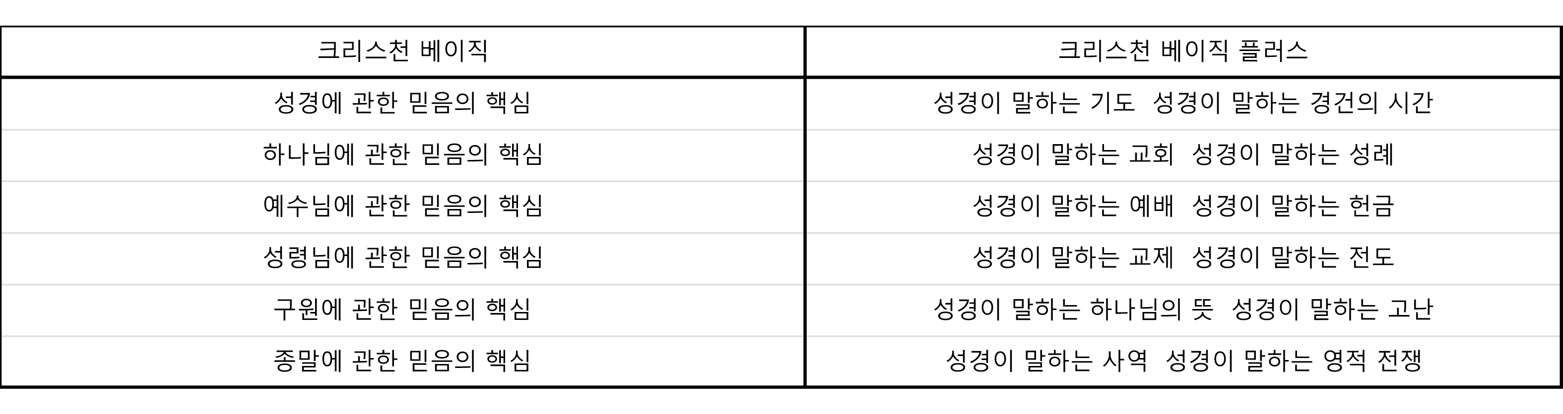 ① 크리스천 베이직 & 베이직 플러스 이 과목은 교재가 2권 구성입니다(크리스천 베이직, 크리스천 베이직 플러스). 크리스천 베이직은 교리에, 크리스천 베이직 플러스는 실천에 초점을 맞추고 있습니다. 기독교의 핵심 교리가 무엇인지, 신앙 생활의 요의(要義)가 무엇인지 성경 말씀으로 정의합니다. 각 권의 구성은 아래와 같습니다.