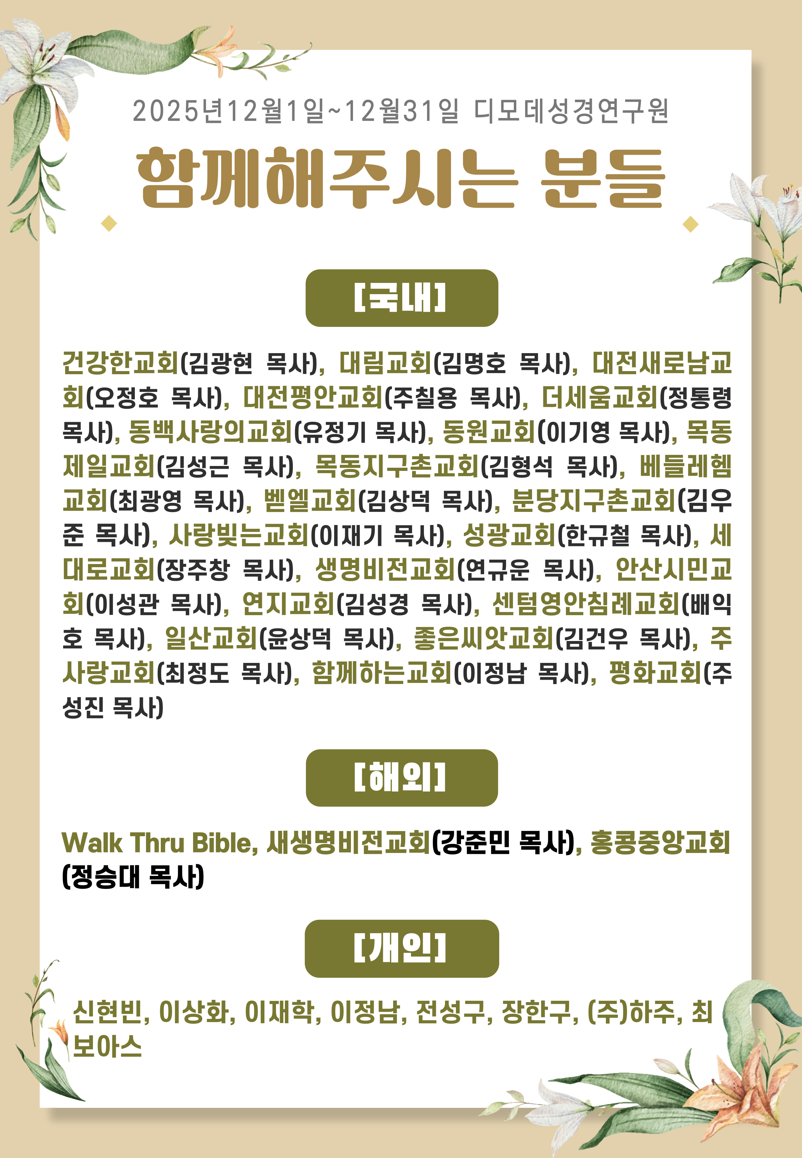 | - | 2025년 12월 디모데성경연구원과 함께해 주신 분들입니다. | 디모데성경연구원 | 2026-01-14 |