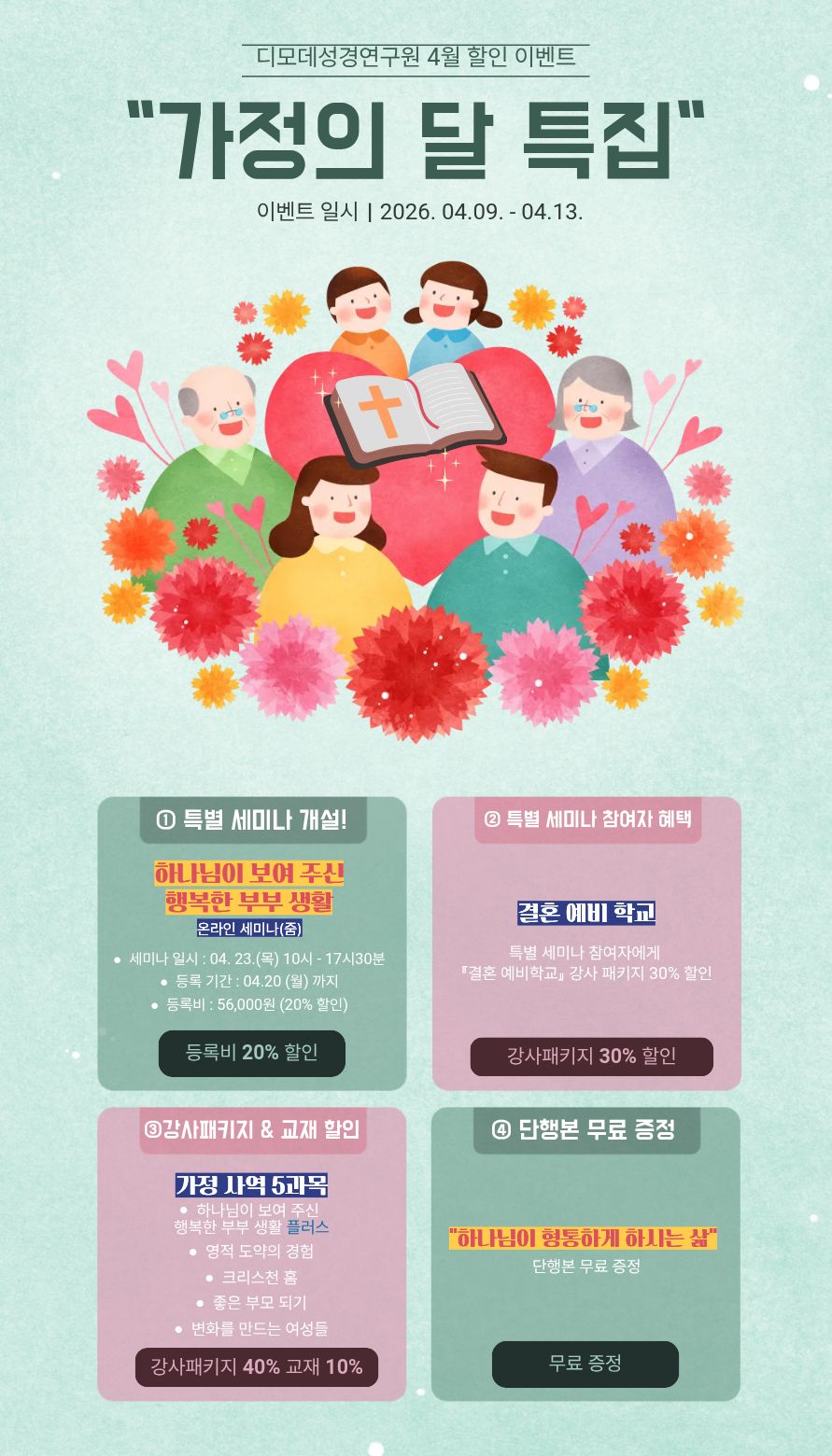 [이벤트 일시] 2026년 4월 9일(목)~4월 13일(월) [이벤트 상세] ☞ 이벤트 ① 특별 세미나(온라인) 개설 & 등록비 20% 할인 - 개설 과목:『하나님이 보여 주신 행복한 부부 생활』 - 등록비: 정가 70,000원 -> 56,000원(20% 할인, 강사패키지 포함) - 세미나 일시: 2026년 4월 23일(목), 오전 10시 ~ 오후 5시 30분 - 등록 기한: 2026년 4월 20일(월)까지