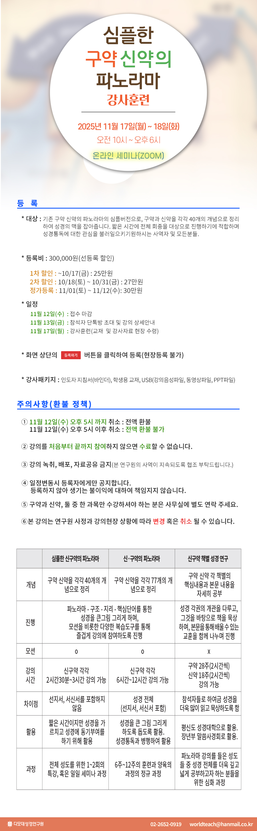 세미나 신청 심플한 신구약의 파노라마 강사훈련(2025년 11월 17일~18일) 글보기2025-11-17 ~ 2025-11-18 / 10:00~18:00ZOOM온라인등록마감: 11월 12일까지* 본 강의는 연구원 사정과 강의현장 상황에 따라 변경 혹은 취소 될 수 있습니다.선착순: 30명현장등록불가2025-09-29~2025-10-17 / 250,000원2025-10-18~2025-10-31 / 270,000원2025-11-01~2025-11-12 / 300,000원글보기글보기글보기등록하기상품정보상품리뷰상품 Q&A배송/반품/교환정보 ZOOM온라인상품정보상품리뷰상품 Q&A배송/반품/교환정보평가리뷰내용작성자날짜등록된 상품 리뷰가 없습니다상품정보상품리뷰상품 Q&A배송/반품/교환정보문의유형문의/답변작성자날짜등록된 상품 문의가 없습니다 상품정보상품리뷰상품 Q&A배송/반품/교환정보 ■ 샘플 동영상관련 상품스튜어드십 선한 청지기의 삶 세미나(2024년 11월 03일) 60,000원건강한 관계형성을 위한 피플퍼즐 세미나(2025년 10월 27일, 월) 70,000원하나님이 조각하시는 걸작품 인생 (2025년 11월 10일) 60,000원구약의 파노라마 강사훈련 (2025년 10월 20일~21일) 300,000원