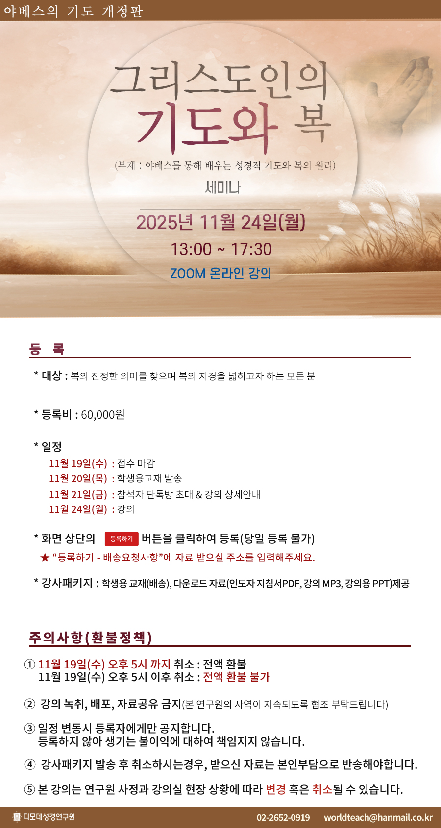 세미나 신청 ZOOM 온라인 강의그리스도인의 기도와 복글보기2025-11-24 ~ 2025-11-24 / 13:00~17:30등록마감: 11월 19일까지※ 본 강의는 연구원 사정과 강의현장 상황에 따라 변경 혹은 취소 될 수 있습니다.선착순: 30명2025-10-15~2025-11-19 / 60,000원2025-10-15~2025-11-19 / 60,000원2025-10-15~2025-11-19 / 60,000원글보기글보기글보기등록하기상품정보상품리뷰상품 Q&A배송/반품/교환정보 상품정보상품리뷰상품 Q&A배송/반품/교환정보평가리뷰내용작성자날짜등록된 상품 리뷰가 없습니다상품정보상품리뷰상품 Q&A배송/반품/교환정보문의유형문의/답변작성자날짜등록된 상품 문의가 없습니다 상품정보상품리뷰상품 Q&A배송/반품/교환정보 ■ 샘플 동영상관련 상품스튜어드십 선한 청지기의 삶 세미나(2024년 11월 03일) 60,000원심플한 신구약의 파노라마 강사훈련(2025년 11월 17일~18일) 300,000원하나님이 조각하시는 걸작품 인생 (2025년 11월 10일) 60,000원건강한 관계형성을 위한 피플퍼즐 세미나(2025년 10월 27일, 월) 70,000원