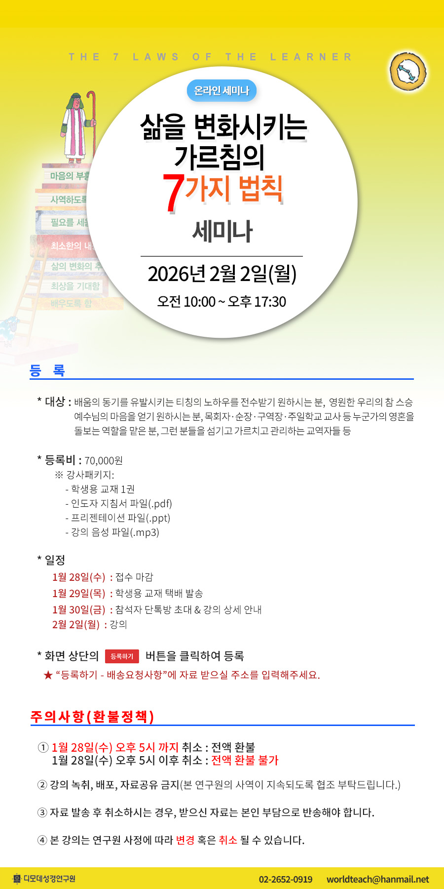 세미나 등록 신청 ZOOM 온라인 강의삶을 변화시키는 가르침의 7가지 법칙 세미나(2026년 2월 2일)글보기2026-02-02 ~ 2026-02-02 / 10:00~17:30등록마감: 01월 28일까지※ 본 강의는 연구원 사정과 강의 현장 상황에 따라 변경 혹은 취소 될 수 있습니다.선착순: 30명2025-12-24~2026-01-28 / 70,000원2025-12-24~2026-01-28 / 70,000원2025-12-24~2026-01-28 / 70,000원글보기글보기글보기등록하기상품정보상품리뷰상품 Q&A배송/반품/교환정보 상품정보상품리뷰상품 Q&A배송/반품/교환정보평가리뷰내용작성자날짜등록된 상품 리뷰가 없습니다상품정보상품리뷰상품 Q&A배송/반품/교환정보문의유형문의/답변작성자날짜등록된 상품 문의가 없습니다 상품정보상품리뷰상품 Q&A배송/반품/교환정보 ■ 샘플 동영상관련 상품건강한 관계형성을 위한 피플퍼즐 세미나(2026년 1월 5일) 70,000원인간의 선택 하나님의 섭리 세미나 (2026년 01월 19일) 60,000원구약의 파노라마 강사훈련 (2026년 1월 12일~13일) 300,000원신약의 파노라마 강사훈련 (2026년 1월 26일~27일) 250,000원