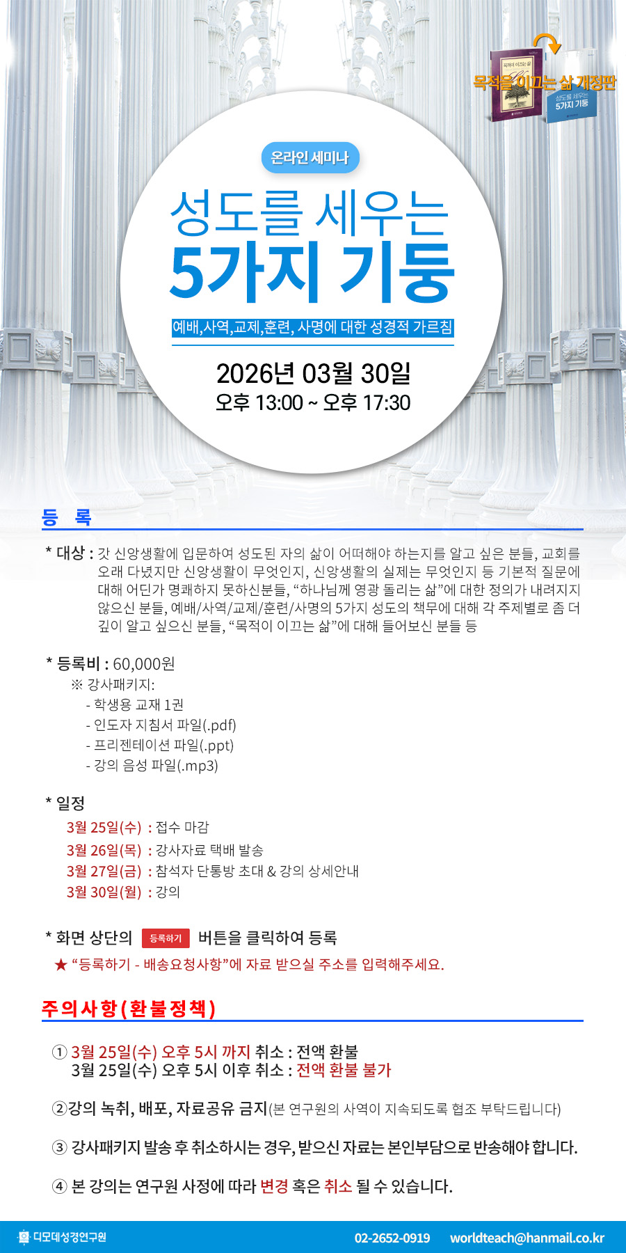 세미나 등록 신청 ZOOM 온라인 강의성도를 세우는 5가지 기둥(2026년 3월 30일 월요일)글보기2026-03-30 ~ 2026-03-30 / 13:00~17:30등록마감: 03월 25일까지※ 본 강의는 연구원 사정과 강의 현장 상황에 따라 변경 혹은 취소 될 수 있습니다.선착순: 30명2026-02-05~2026-03-25 / 60,000원2026-02-05~2026-03-25 / 60,000원2026-02-05~2026-03-25 / 60,000원글보기글보기글보기등록하기상품정보상품리뷰상품 Q&A배송/반품/교환정보 상품정보상품리뷰상품 Q&A배송/반품/교환정보평가리뷰내용작성자날짜등록된 상품 리뷰가 없습니다상품정보상품리뷰상품 Q&A배송/반품/교환정보문의유형문의/답변작성자날짜등록된 상품 문의가 없습니다 상품정보상품리뷰상품 Q&A배송/반품/교환정보 ■ 샘플 동영상관련 상품하나님의 눈으로 하나님의 딸들 보기(2026년 02월 23일) 60,000원하나님이 보여주신 행복한 부부생활(2026년 3월 9일 월요일) 70,000원건강한 관계형성을 위한 피플퍼즐 세미나(2026년 3월 23일) 70,000원구약의 파노라마 강사훈련 (2026년 3월 16일~17일) 300,000원