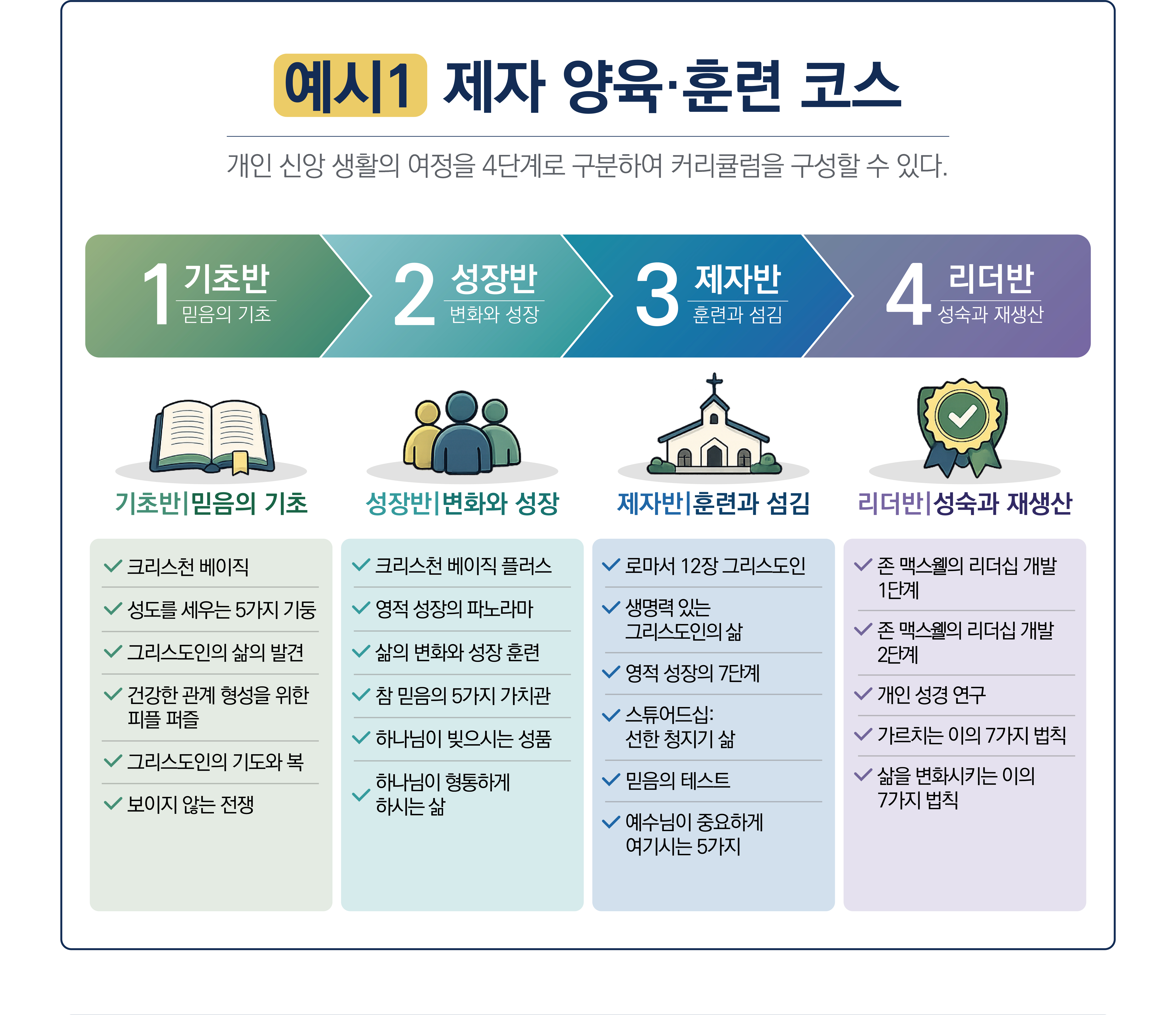 디모데성경연구원 과목들을 활용하여 여러분 교회의 양육•훈련 커리큘럼을 다음와 같이 구성할 수 있습니다.